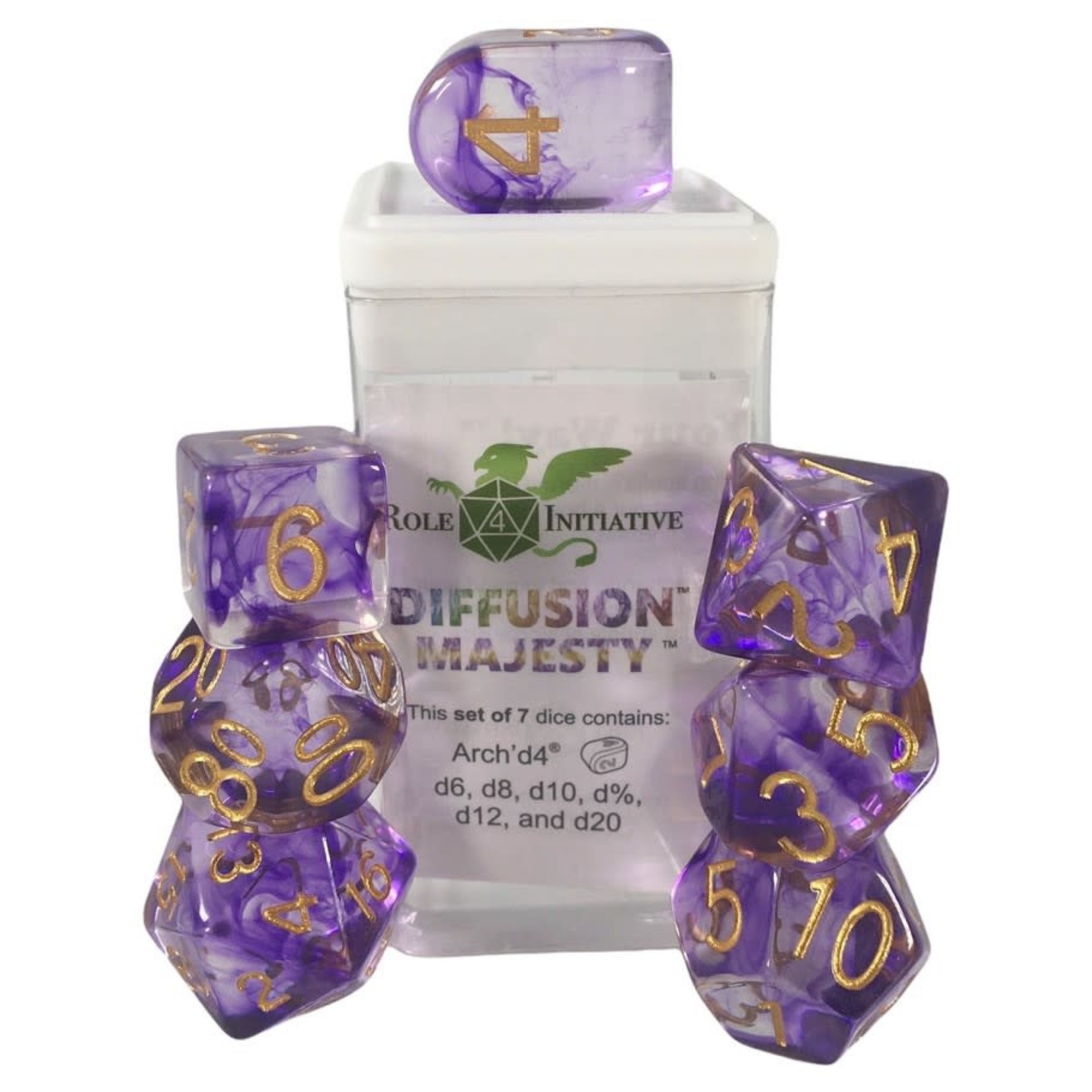 This set of 7 dice in Diffusion Majesty includes Arch'd4, d6, d8, d10, d%, d12, and Balance'd20. Role 4 Initiative dice average about 25% larger than traditional dice and come in a plastic display box. The Arch'd4 is a uniquely shaped die that features large top-face numbers and is easier to read, pick up, and roll. The Balance'd20 has a unique arrangement of numbers so that any 5 adjacent sides add to either 52 or 53 to ensure the most even distribution of outcomes.